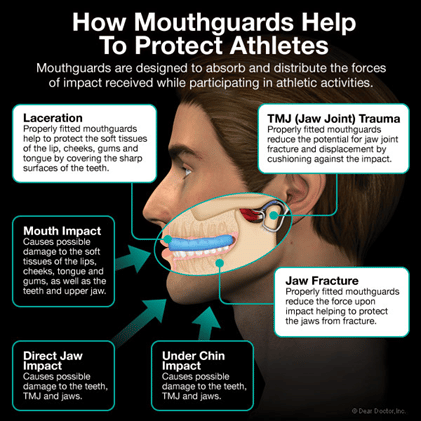 A custom-fitted mouthguard works by absorbing and spreading the impact of the damaging blow, and is fabricated based on an impression of your teeth and jaw taken by your dentist.